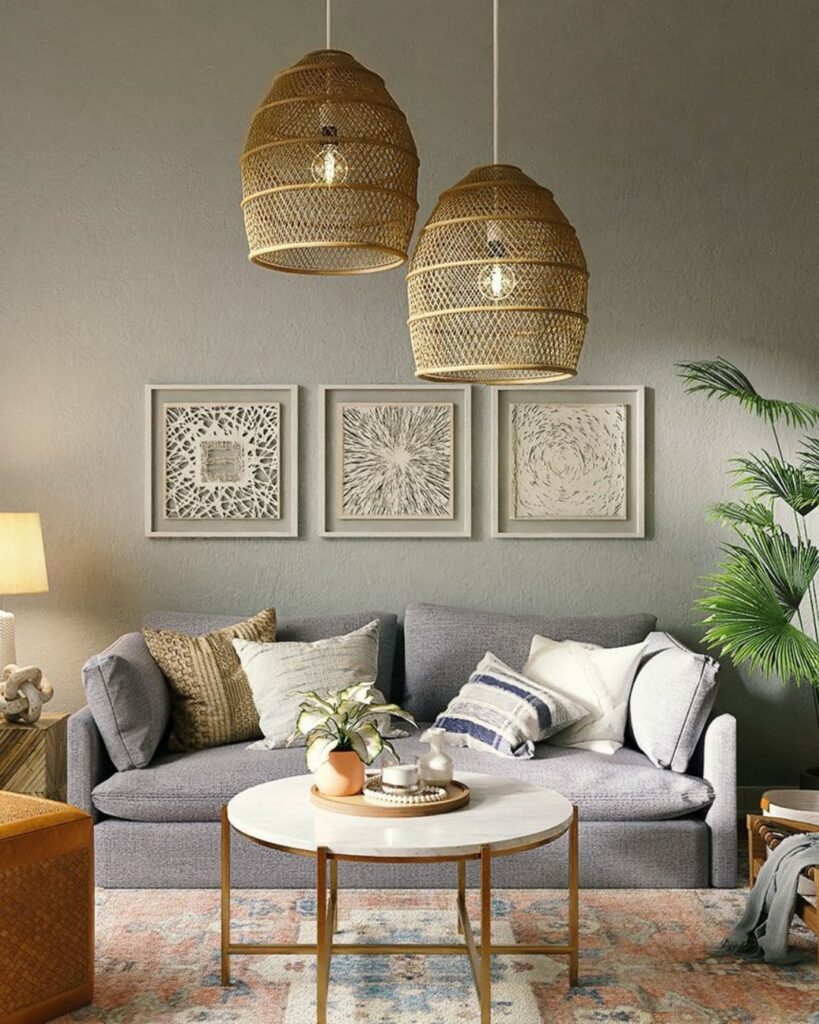 The Warm Boho Chic Living Room feels warm, calm, and inviting. The earthy tones, woven textures and natural materials make it look grounded but cozy. With a comfy sofa layered with throw blankets and cushions, plus a soft textured rug underfoot  the room gives off “chill & welcoming” energy. The mix of wicker, wood, neutral fabrics and green plants brings in warmth and a little bit of nature indoors.