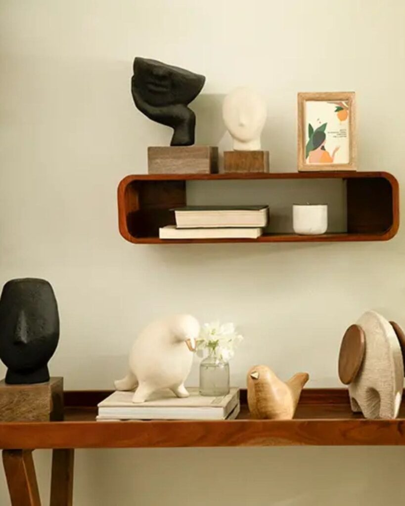 If you love DIY friendly or budget conscious home decor ideas, this style fits perfectly. All you need are a couple of good shelves, maybe some small art pieces or handcrafted figurines and a few books or plants to add personality. This is also part of a growing trend for “warm minimalism”  , minimal clutter but with natural textures and a bit of character.
