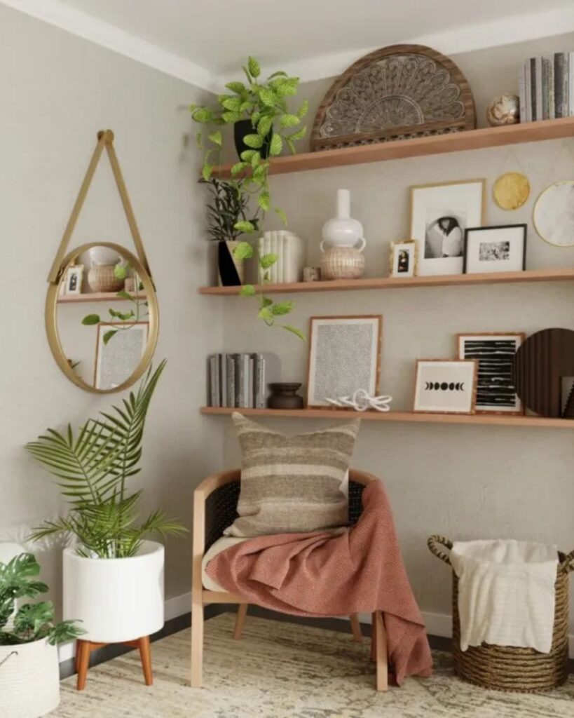 The little Warm Boho Living Room corner feels calm and intentional. The warm wood shelves, soft chair with a cozy throw, and a few green plants come together to create a peaceful, homey vibe. The decor is minimal yet textured natural materials, gentle earthy tones and just the right amount of detail  so the space feels cozy without ever being cluttered.