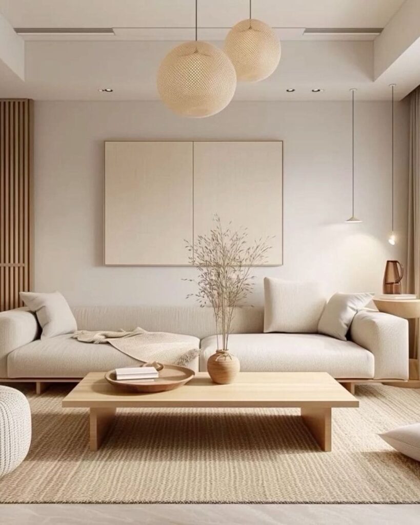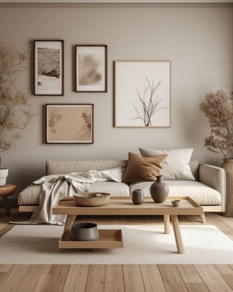 The Calm Minimalist Living Room that calm, cozy vibe many of us look for in home decor right now. Soft neutral tones, light wood furniture, and minimal decor pieces work together to make the space feel grounded yet airy. The sofa, low wooden coffee table and muted artwork come together to create a clean but warm atmosphere, simple, uncluttered and peaceful.