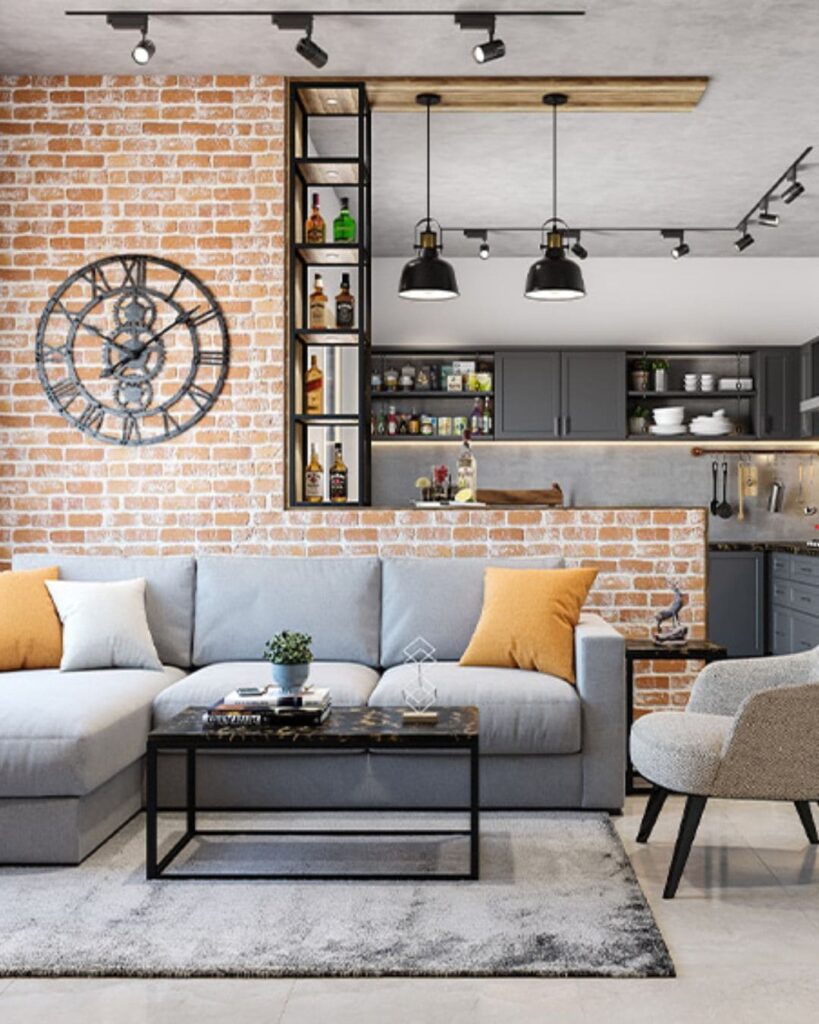The Urban Rustic Living Room mixes raw industrial energy with cozy comfort in a way that feels fresh and real. The exposed brick wall brings texture and warmth, while the sleek sofa, soft cushions and neat coffee table balance it all. Add a splash of color with a mustard pillow and you have got that perfect “chill but stylish” vibe.
