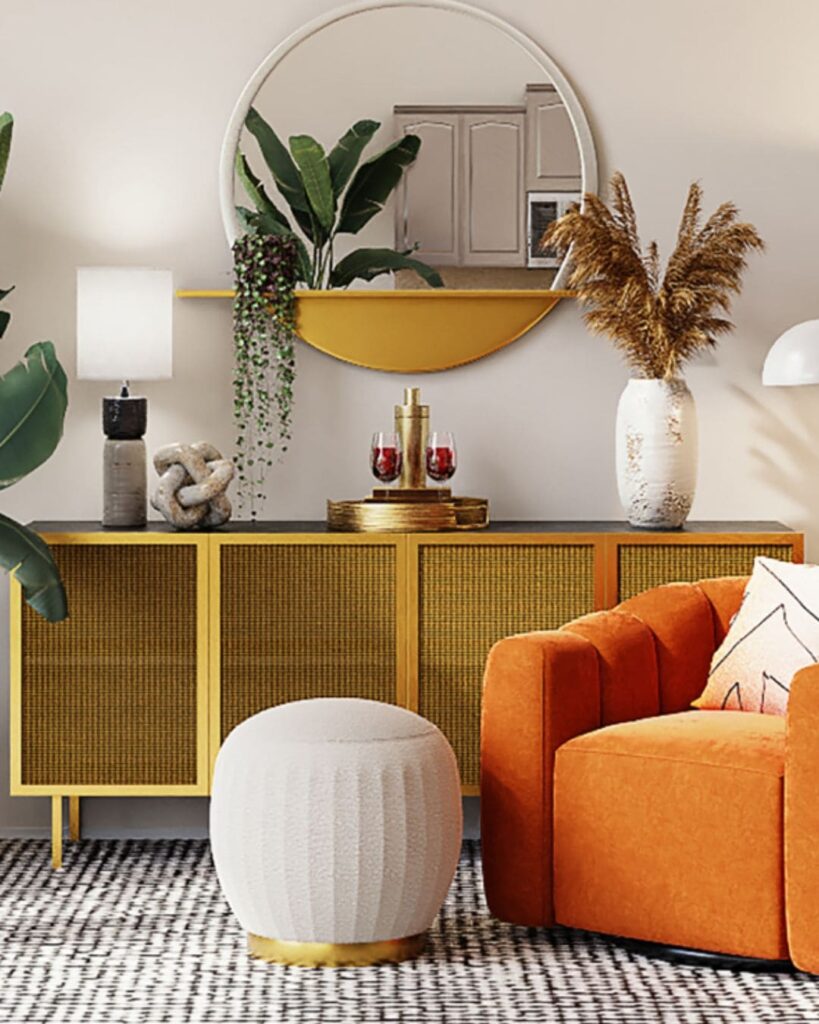 The Warm and Stylish Living Room feels calm, grounded and easy on the eyes. Soft, earthy tones, wood furniture and a big round mirror work together to create a cozy, welcoming vibe. The mix of a simple sideboard, a few plants and subtle decorative pieces gives it a clean look that still feels warm and lived in. It’s the kind of space where you walk in and instantly relax.