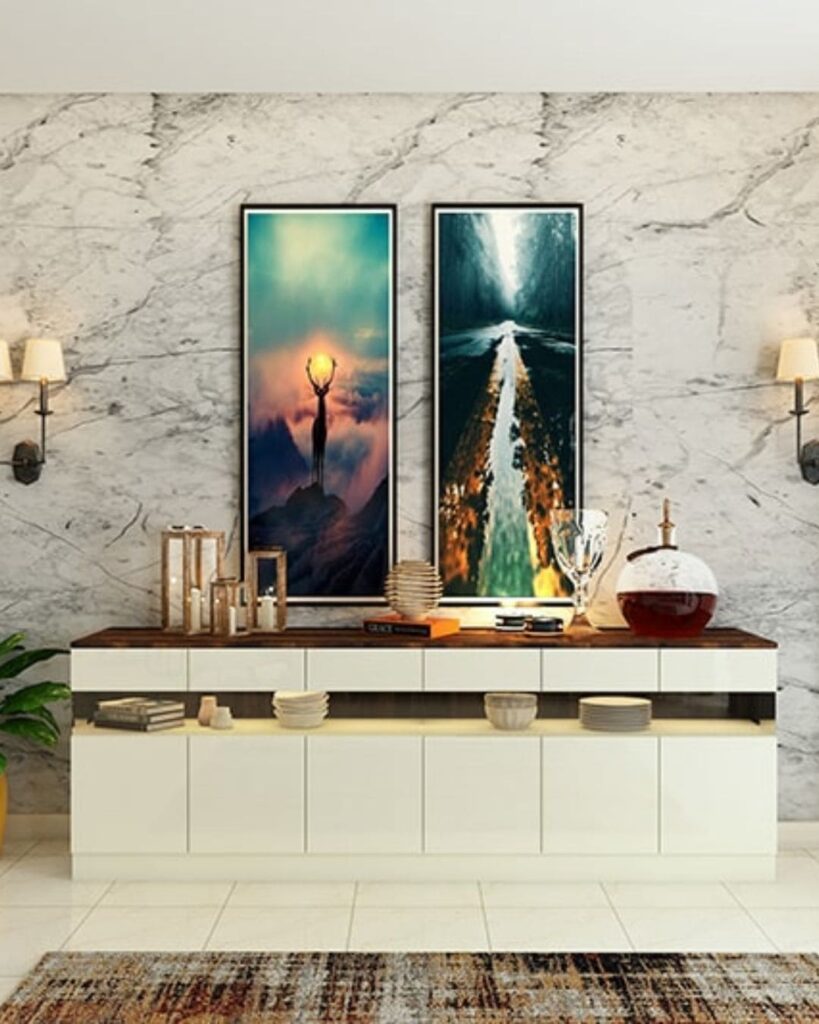 The Clean and Elegant Living Room feels refined and thoughtfully styled. The smooth marble look wall behind the console adds a sense of sophistication and depth, while the clean white cabinet keeps things minimal yet functional. The two tall pieces of framed art with bold, contrasting colors draw the eye acting as a focal point in the room without making the space feel busy.