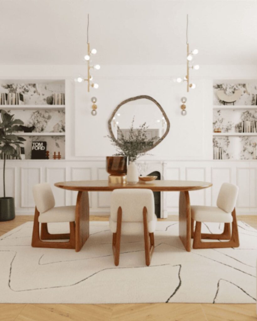 The Warm Wood and Mirror Dining Space feels calm, inviting, and thoughtfully put together. The wooden table and chairs give it a natural, home grown warmth. Add a nice mirror on the wall and a couple of statement pendant lights, and voila the room suddenly feels more open and welcoming. The neutral tones keep it soft and easy on the eyes, while wood and simple decor add a warm, friendly touch.
