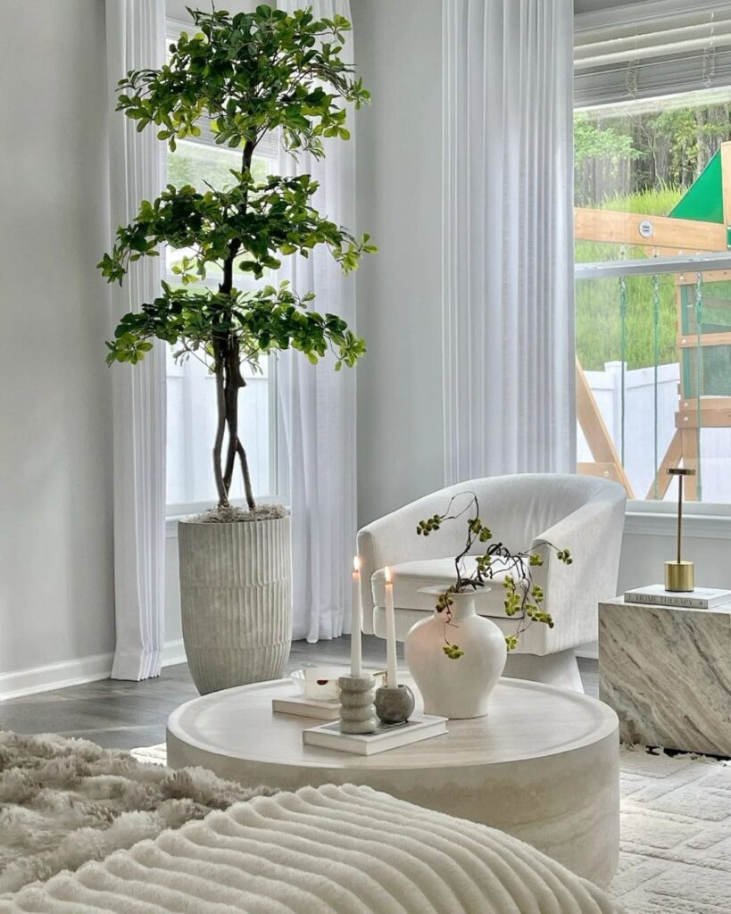 The Beautiful Calm and Cozy Space instantly gives soft, peaceful vibes, the kind of corner where you sip warm coffee and unwind after a long day. The clean white tones, layered textures, and the tall indoor plant create a refreshing balance of modern elegance and nature. It’s a perfect example of home decor ideas that feel both simple and luxurious. If you love exploring current home decor trends, this style fits right in with calm neutrals, round shapes, and cozy fabrics.