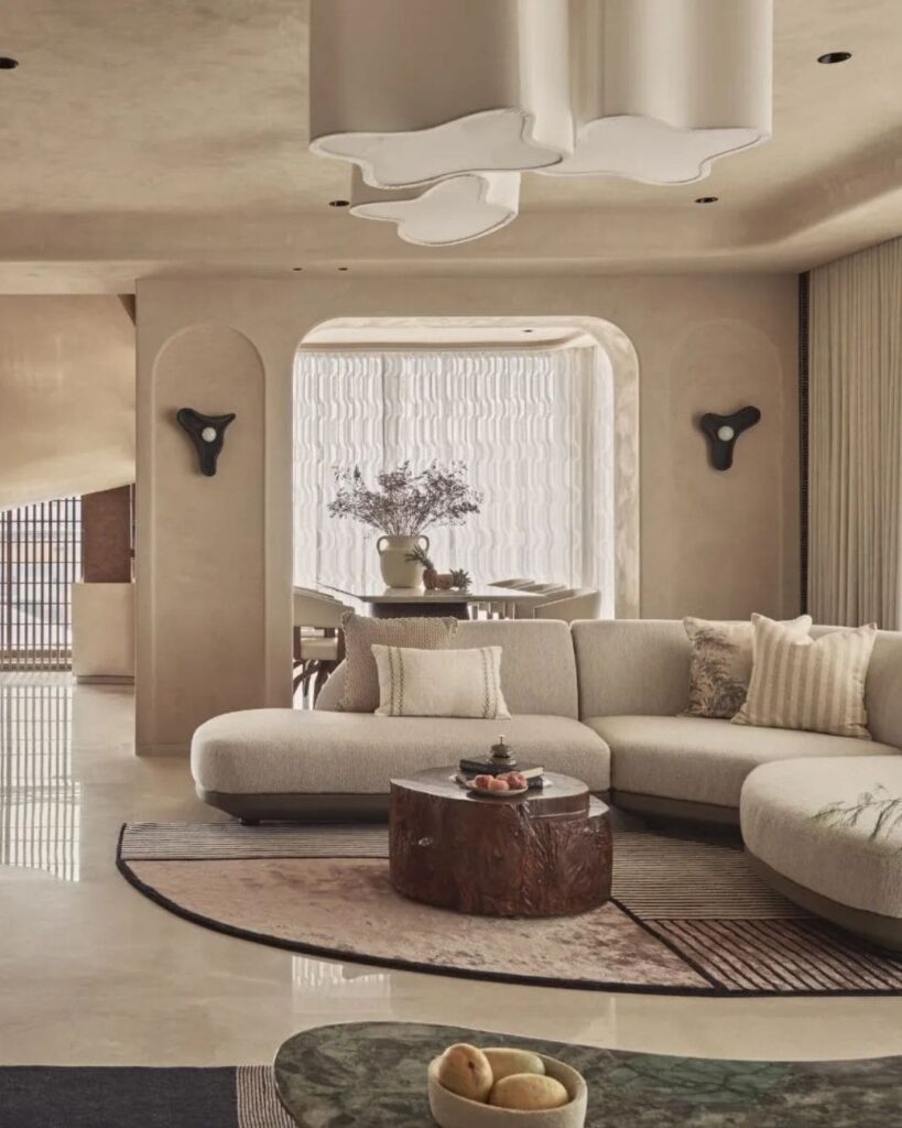 The Modern Luxe Serenity feels like stepping into a calm, luxury retreat with soft curves, warm neutrals and elegant textures that make everything look peaceful yet high end. The rounded sofa, sculptural ceiling lights and the wooden center table are perfect examples of current home decor trends where organic shapes and earthy materials take the spotlight. If you are searching for refined yet simple home decor ideas, this room shows how minimalism can still feel rich and inviting.