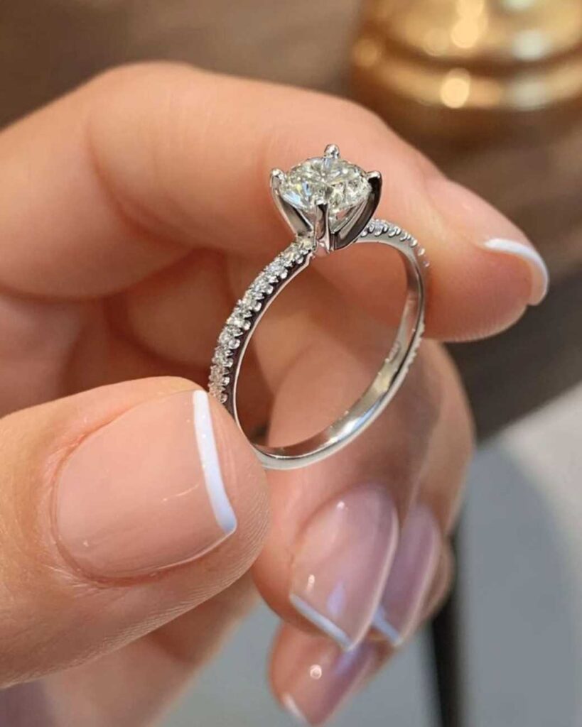Along with its stylish look, it’s also ideal as an engagement ring or part of a wedding ring set. The smaller diamonds along the band enhance the brilliance of the main stone, symbolizing shared love and precious memories. It stays classy and chic while carrying a meaningful touch.