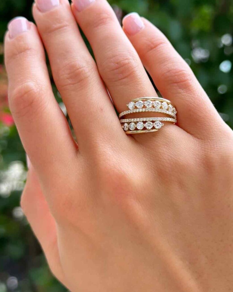 And to make it even better, this piece can double as wedding rings or darry rings for anyone who wants a touch of extra luxury. The wrap style shape gives your hand a fuller, more elegant look. It’s stylish, eye-catching and perfect for someone who wants a ring that feels both glamorous and personal.