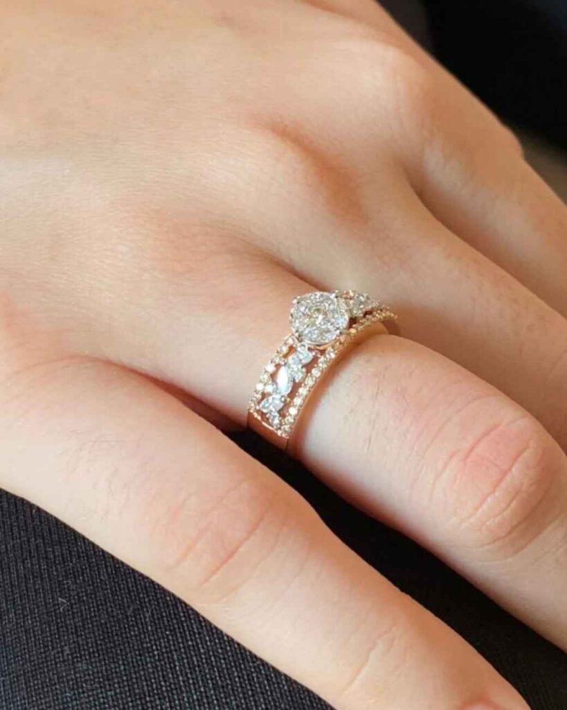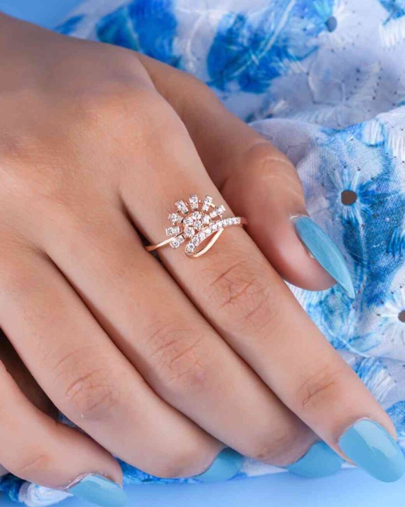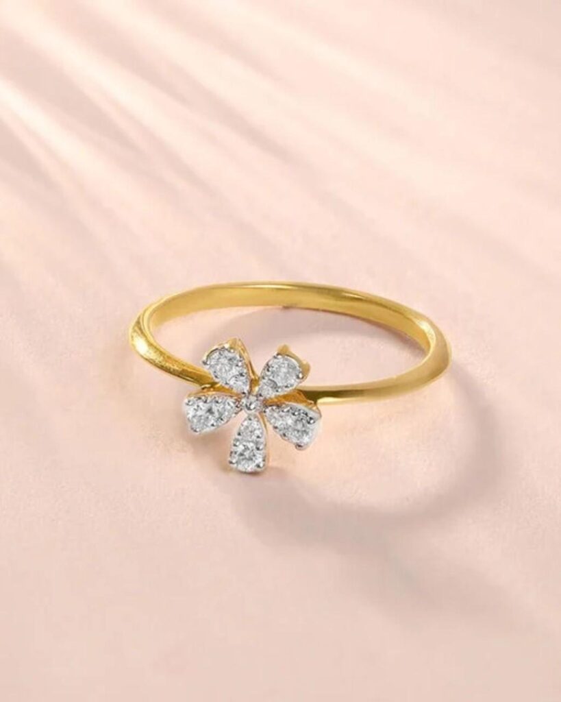 On top of its eye-catching design, it’s also a lovely choice for anyone who adores timeless diamond engagement rings or delicate wedding rings. The floral cluster of diamonds symbolizes love and unity, turning it into a sweet reminder of cherished moments. Its dainty yet luxurious style works with every outfit. from casual fits to bridal looks.