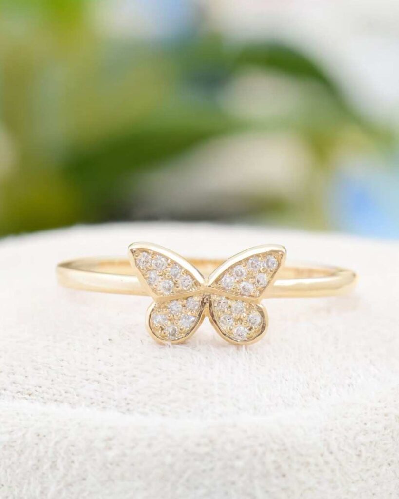 Along with its dainty style, it’s a lovely option if you’re searching for a unique engagement ring or a sweet promise ring. The butterfly shape symbolizes growth, love, and new beginnings, which makes it a fitting choice for wedding rings or modern diamond engagement rings. It feels fresh, youthful, and full of charm.
