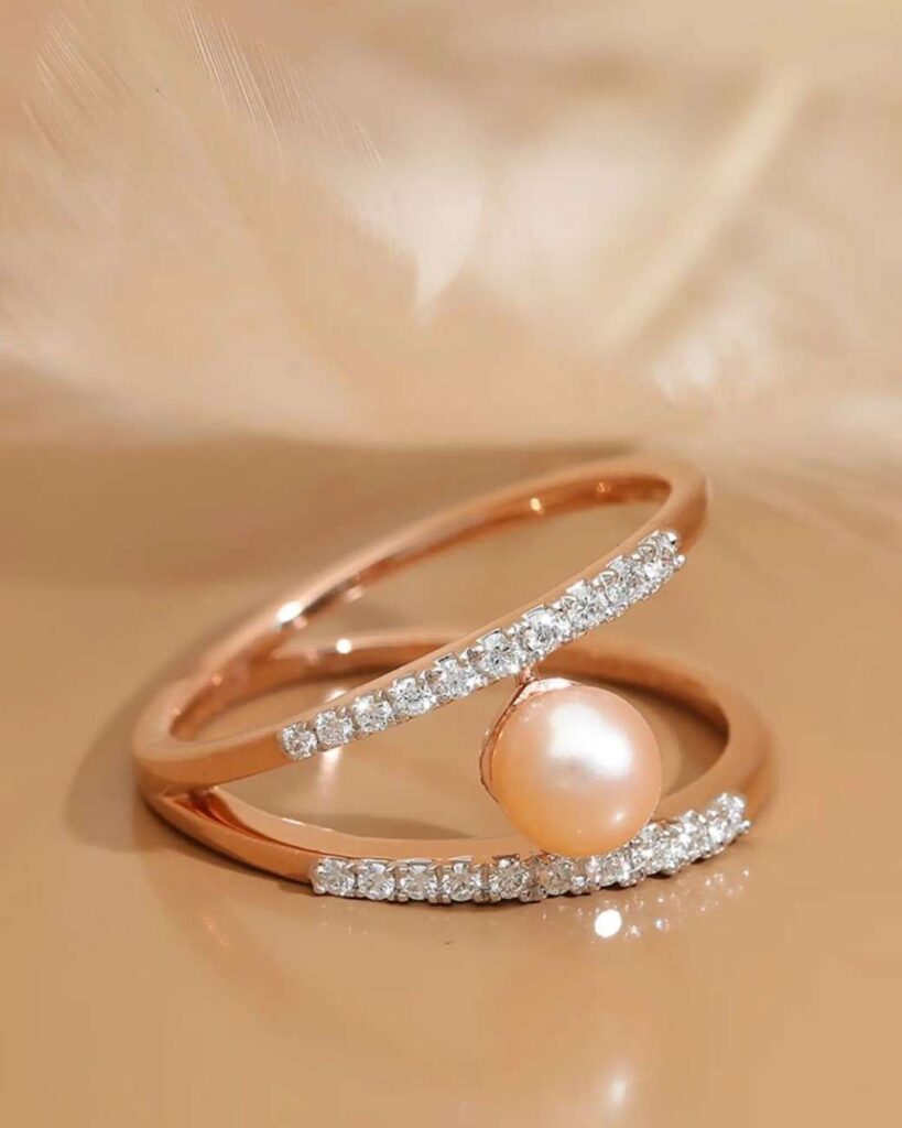 Along with its fresh style, it still carries a romantic feeling even though it’s different from a classic diamond ring or engagement ring. The pearl sits beautifully in the center, making it a lovely option for anyone who prefers unique wedding rings or wants something a little extra for special moments. Its gentle glow works for both everyday outfits and big celebrations.