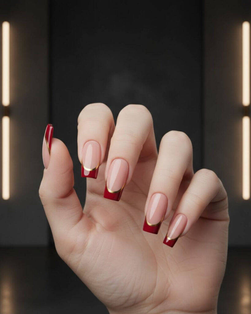 When I first saw red and gold nails on social media, I thought they might be too fancy. After trying this Red French Tip with a gold accent, I am obsessed with this. I have tried various Red French Tip Nail Designs over the years but adding the thin gold line transforms the classic look into something modern.