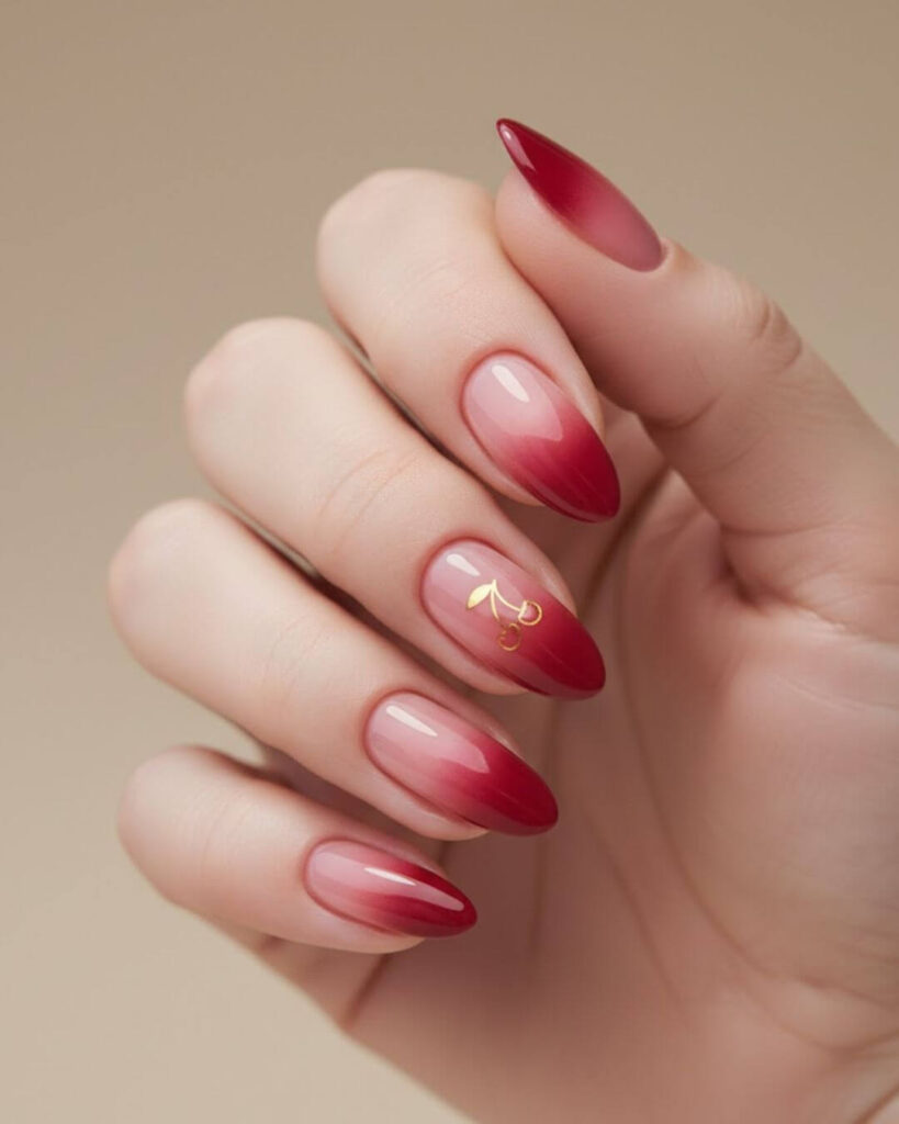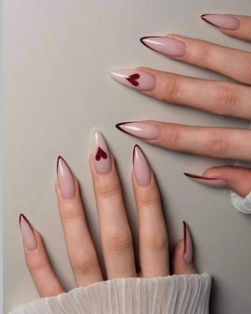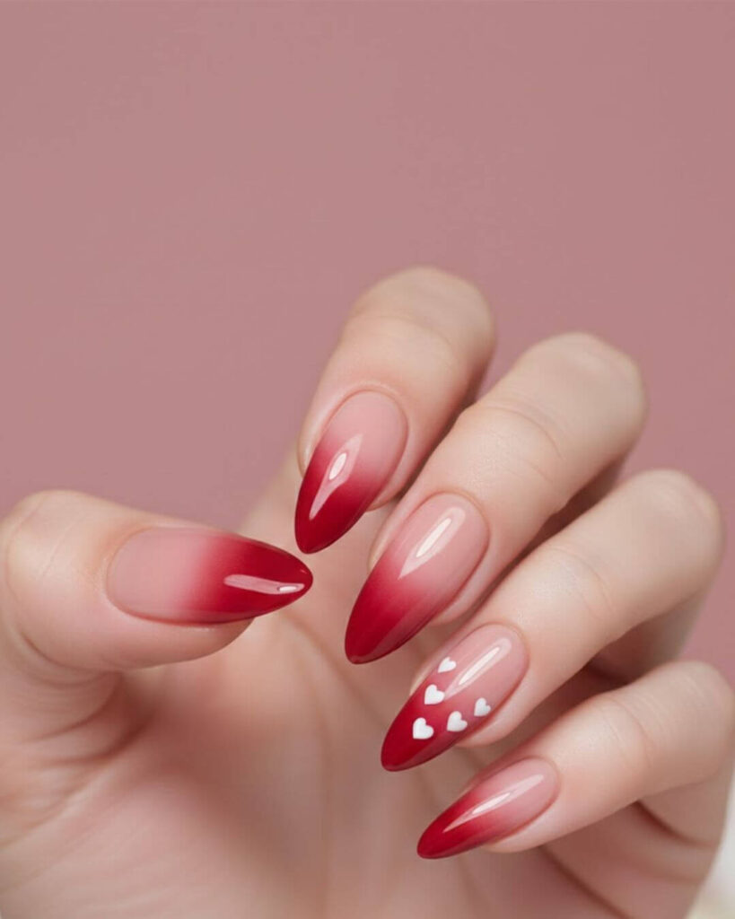 The Red Ombre Nail look feels soft, romantic and a little romantic in the best way. The smooth fade from nude deep red looks effortless, while the tiny white heart details add a sweet and personal touch. These almond red nails are perfect if you want something modern but still wearable.