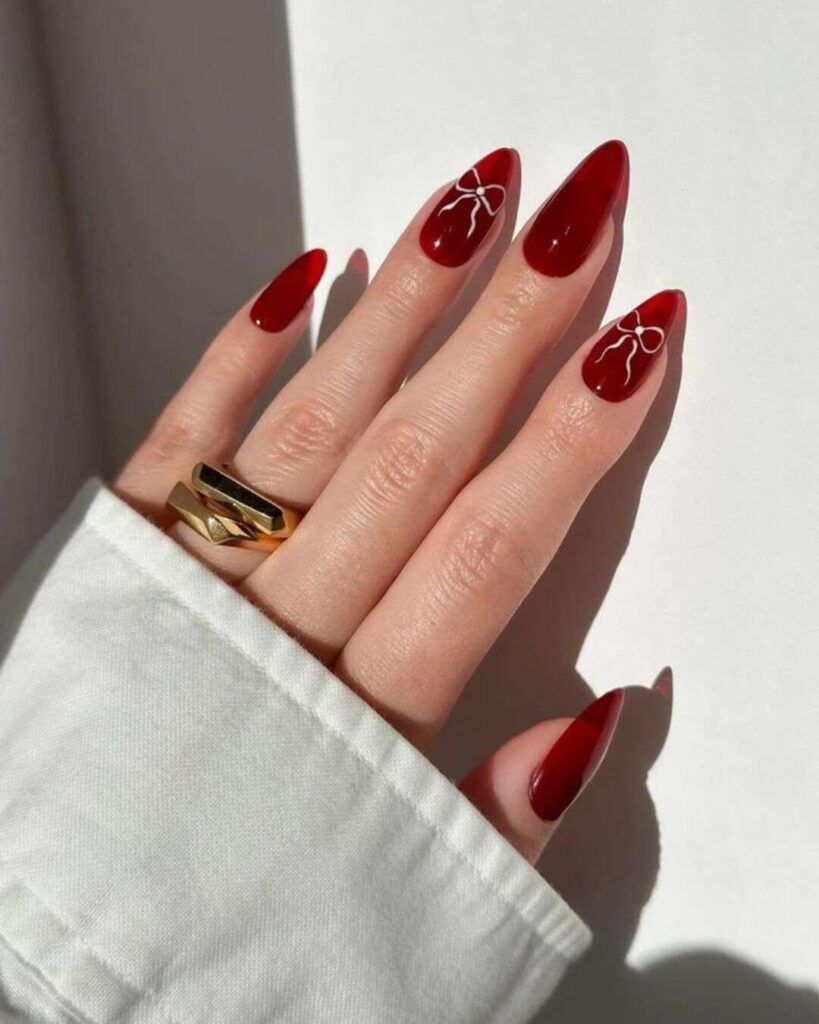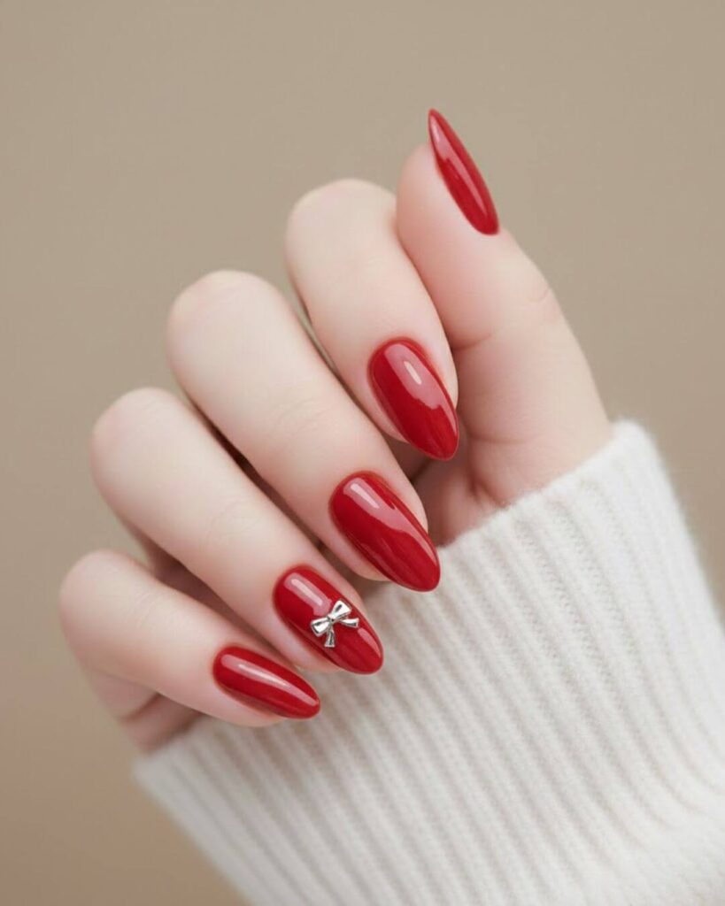 There are some nail designs that feel trendy and exciting for a moment and then there are designs that make you realize you have finally found your signature look. The rich red polish already gives that classic, confident vibe but the tiny silver bow adds a soft feminine twist that makes the whole design feel special.