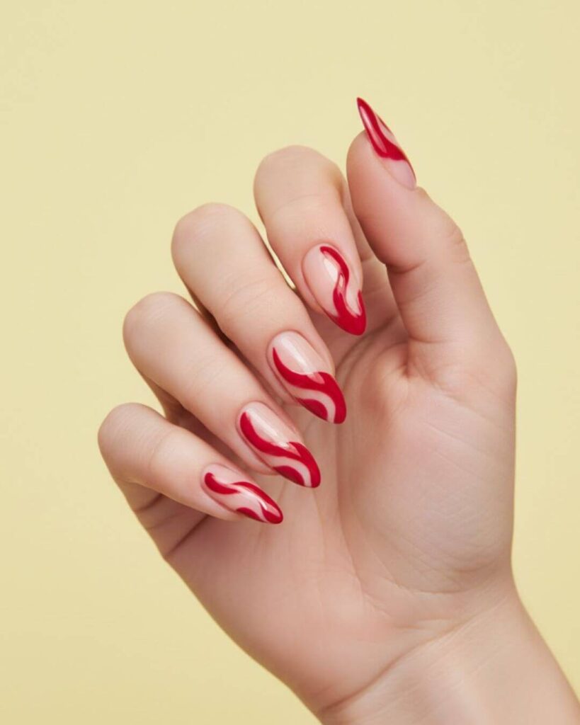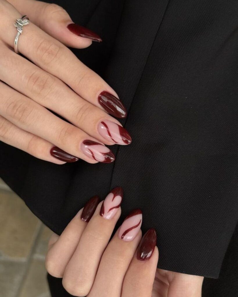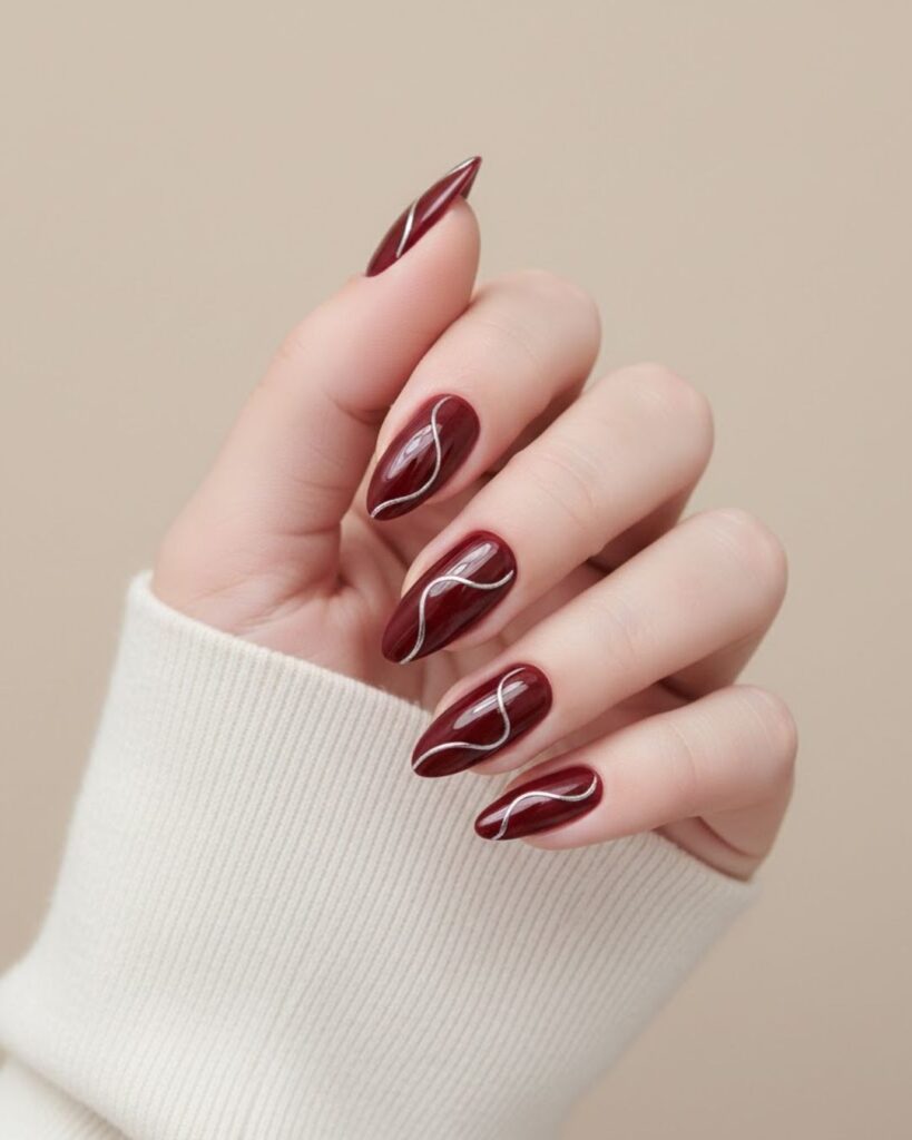 Burgundy Red Nail with Modern Swirl Design like these always remind me why this color never goes out of style. What really stands out in this design is the flowing red swirl pattern. It adds movement and personality without feeling too busy.