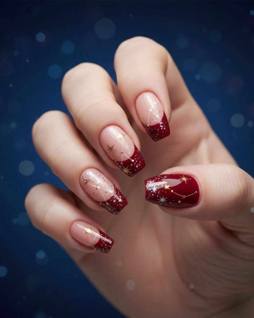 The combination of the nude base, glittery red tips and those delicate gold star accents made my hands look like a luxury magazine spread. What I love most about this nail design is how customizable it is so you can keep it simple with just glitter tips.