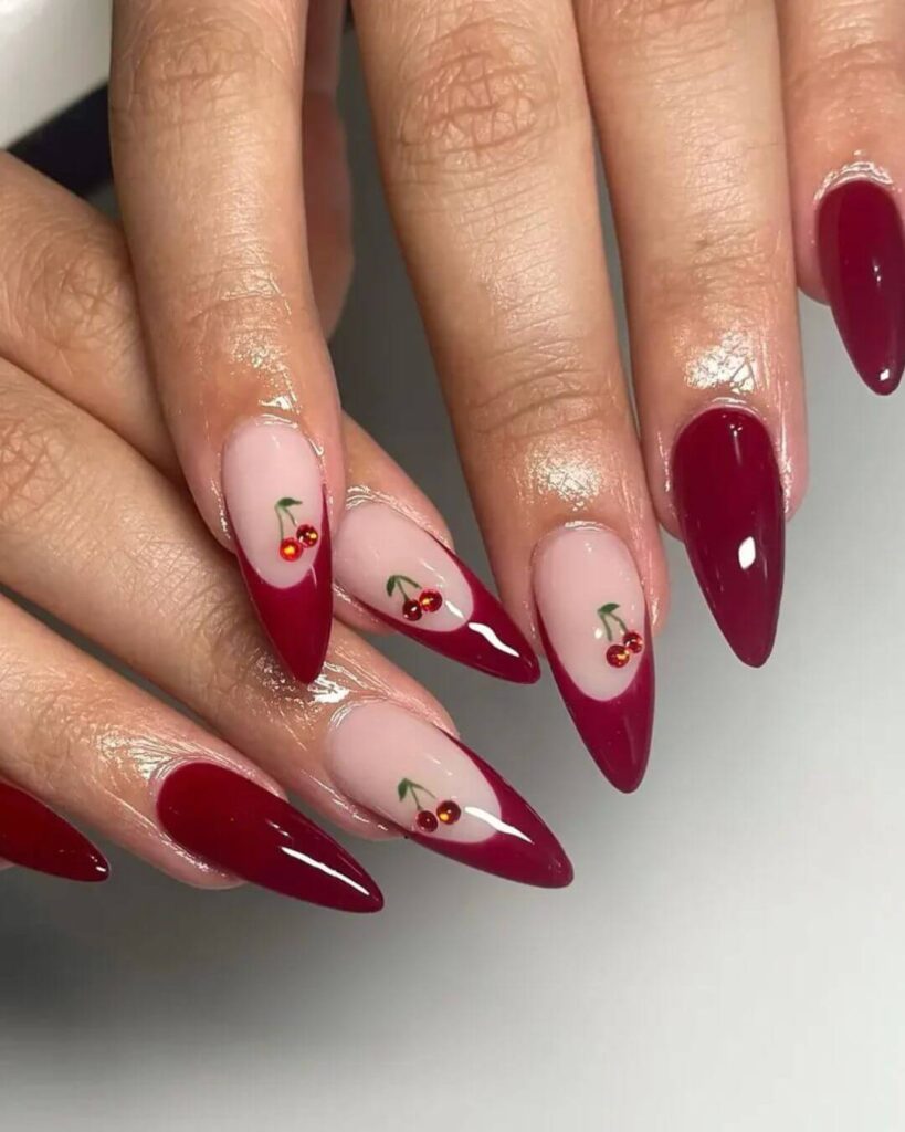 There’s something about the combination of deep burgundy nails, sharp stiletto tips and adorable cherry accents that makes me feel like the most confident and put-together version of myself. The cherry accents specifically work because they are small enough to read as a delicate detail.