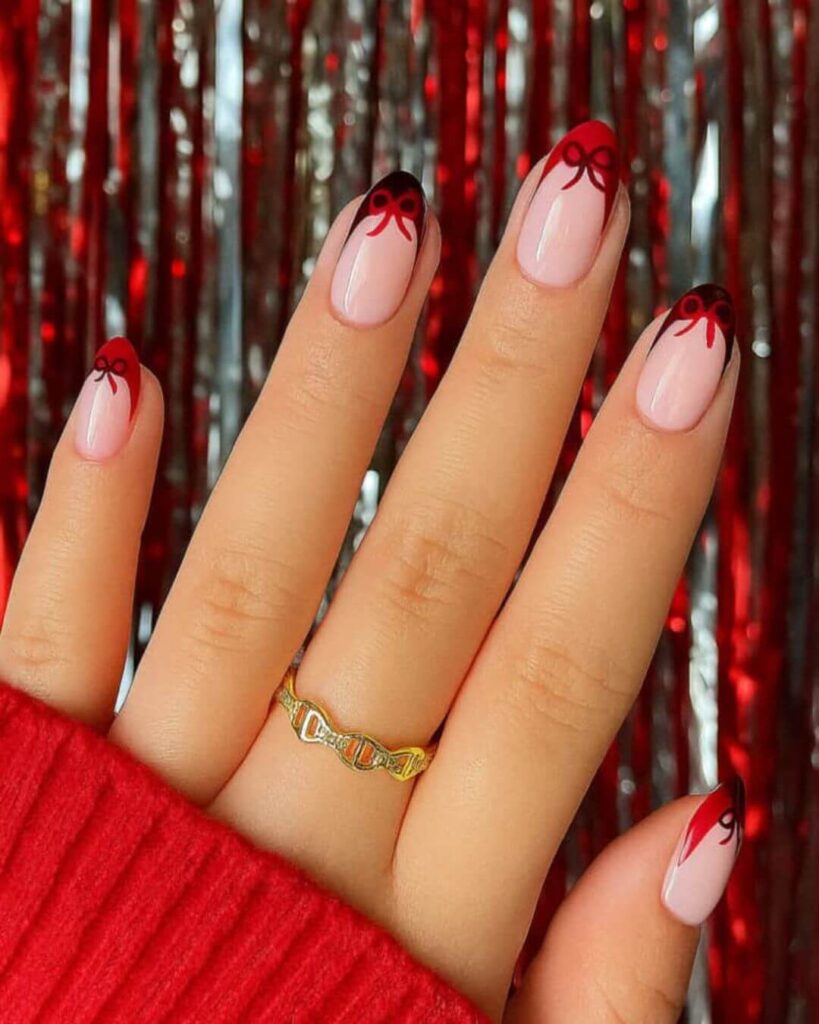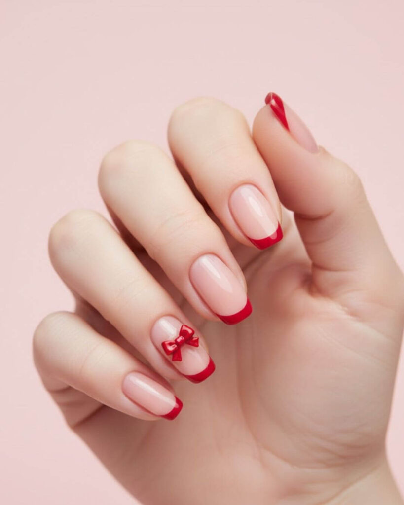 19. Red Bow French Tip Nails