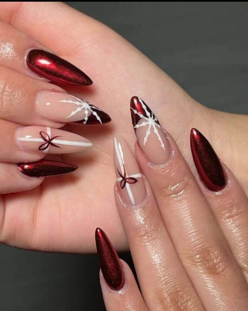 The rich metallic shine paired with the delicate white detailing and tiny bow accents creates a perfect mix of bold and elegant. Searches for red chrome nails, metallic nails and almond shaped nails  are seriously trending and this looks to check every box.