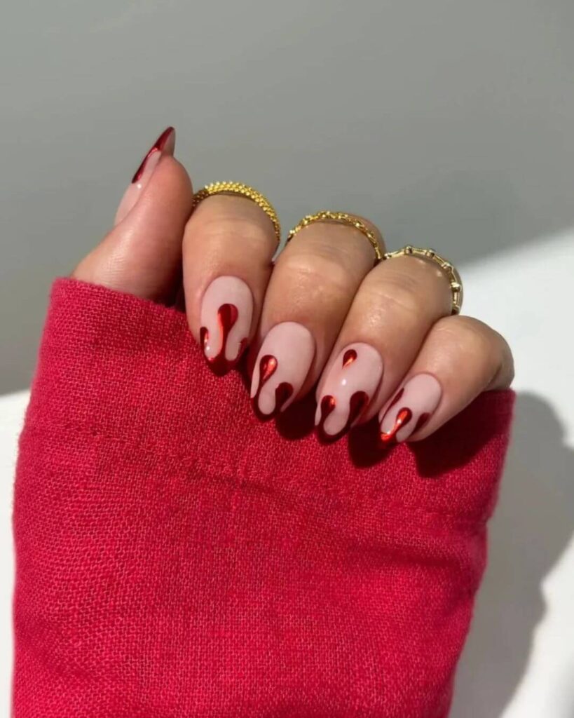 I have to say this Red Chrome Drip Almond Nail look feels bold in the best way. The nude base with that glossy red drip effect gives such a good contrast. There is something about red nails that instantly boosts your confidence and when you add a creative twist like this.