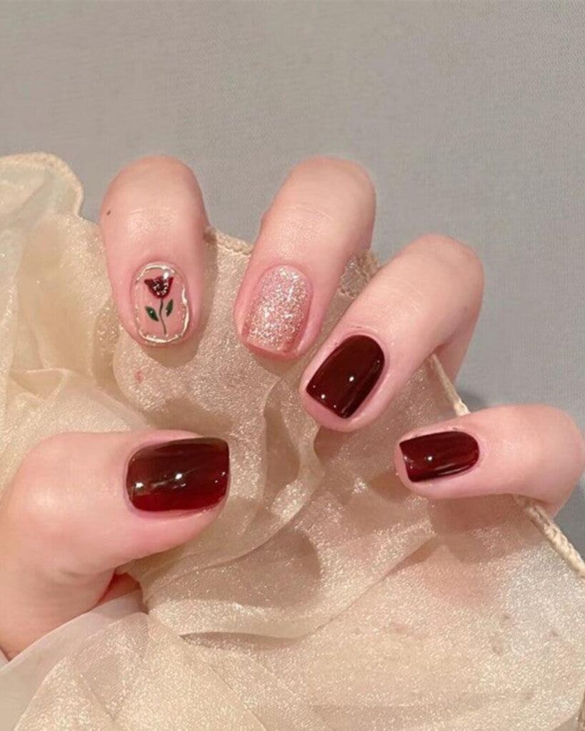 These short burgundy nails with their rose gold sparkle and delicate rose art taught me that the best choices in beauty like the best choices in life are not compromised at all. Start celebrating them as an opportunity to discover nail art that’s both gorgeous and genuinely livable.