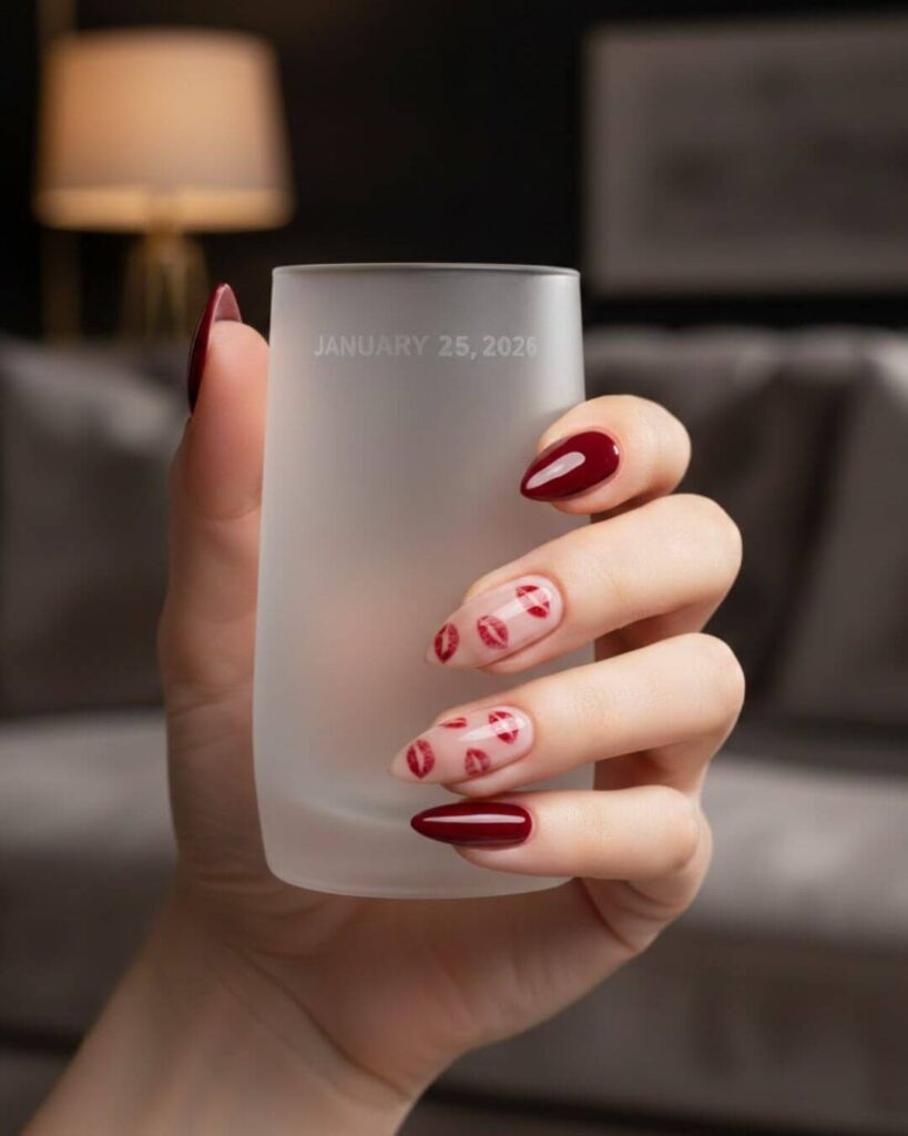 23. Burgundy Almond Nails with Lip Print Art