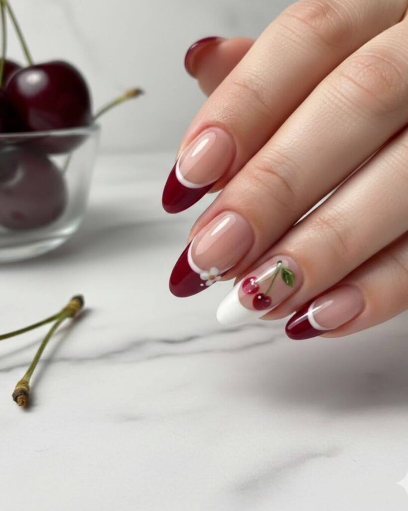 24. Cherry French Tip Almond Nails