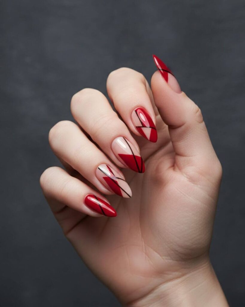 What I have learned from wearing red and nude nails with geometric patterns is that they are versatile. If you are searching for trendy red nails or modern red nail art, this style fits right. It balances elegance and creativity.