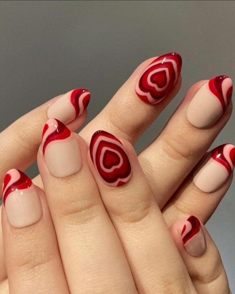 29. Red Heart Nails with Nude Base